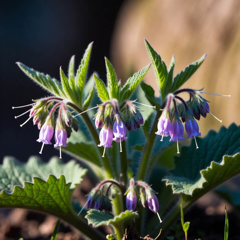 | Symphytum x uplandicum (Russian comfrey) | Early purple bells from April attract queen bumblebees; repeat flushes if cut back. | Moist corners or partial shade | Thrives in damp clay. Mulch to suppress spread if desired. |