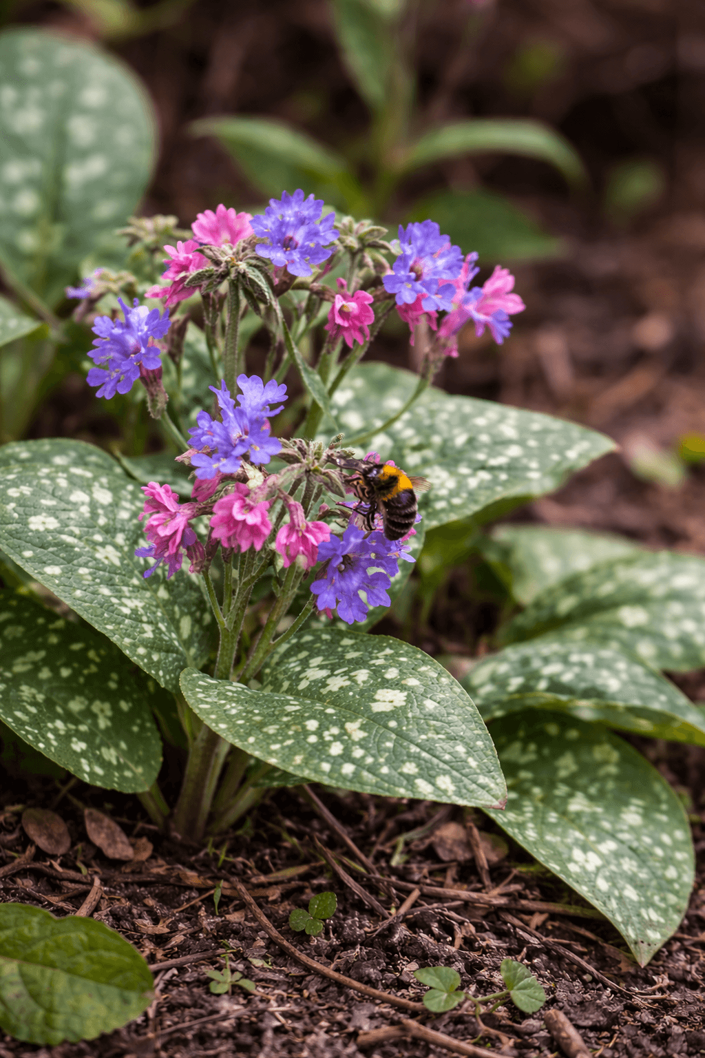 | Pulmonaria officinalis (lungwort) | One of the best early nectar sources for bumblebees; flowers in spring when food is scarce. | Part shade under shrubs or woodland-style borders | Clay friendly and reliable. Mulch annually and cut back tired leaves after flowering. |